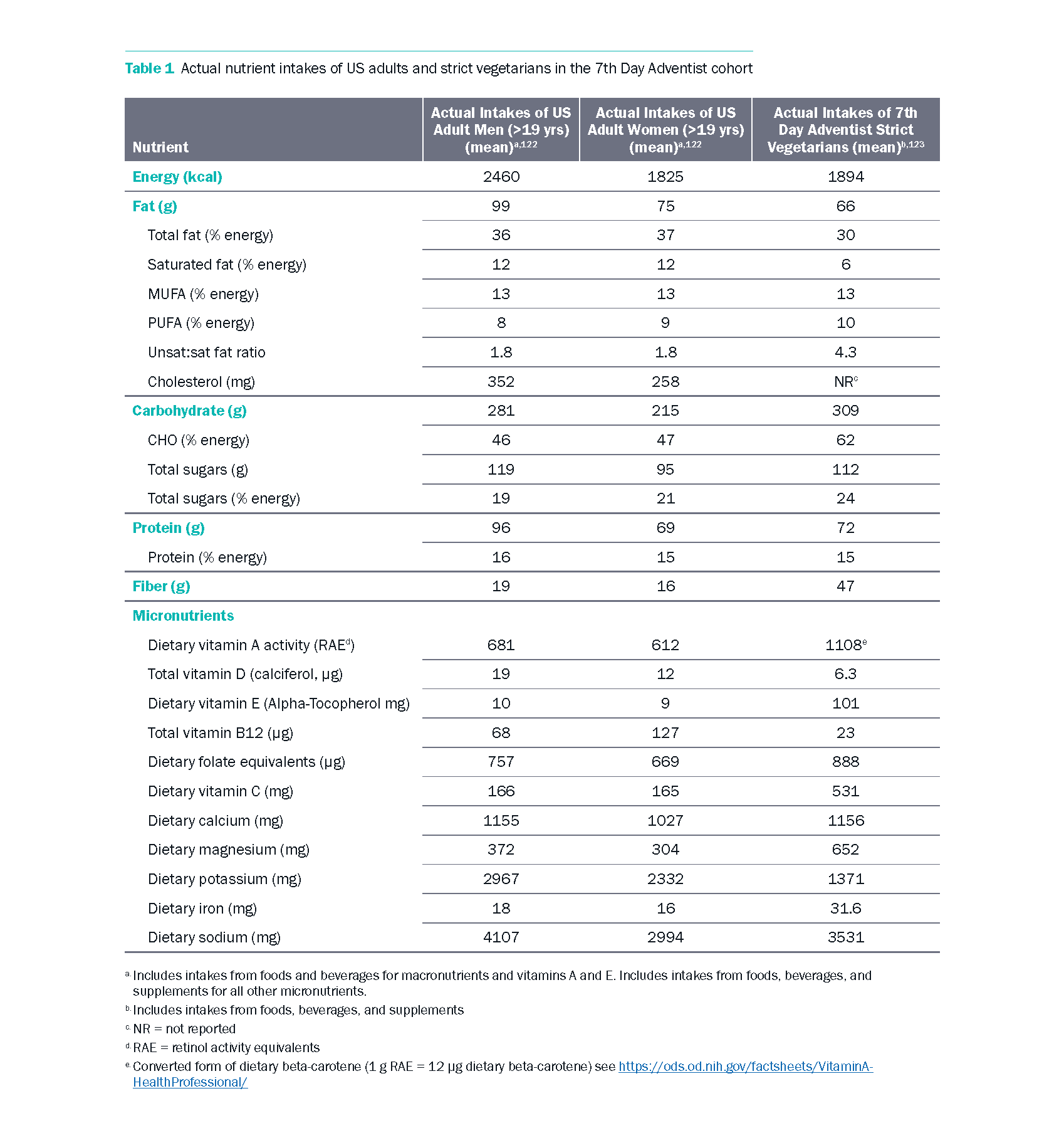 Table 1 displays mean nutrient intakes from US adults, using the What We Eat in America data (National Health and Nutrition Examination 2015–2018) for men and women in comparison to mean intakes among strict vegetarians (completely plant-based/vegan) in the 7th Day Adventist cohort. Striking contrasts are visible for both macro and micronutrients, as well as certain similarities, such as the % protein intake. The mean nutrient intakes of the strict vegetarian group demonstrate the feasibility of plant-based diets to provide adequate nutrient intake.