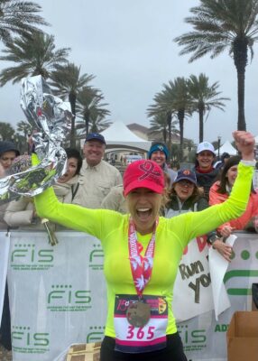 Then, one year and one day after her transplant, Dr. Dawn ran a full marathon, the Donna Marathon, on a cold, drizzly, windy day in Jacksonville. As best anyone can tell, she set a record being the first person to run a marathon just one year after a heart transplant.